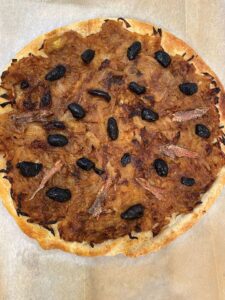 Spread the caramelized onions in a thin layer, leaving half-inch border all around. Arrange the anchovies and olives in a design. Brush the edges of the pastry with the egg wash. Bake for 10 to 15 minutes until the edges are puffed and golden.