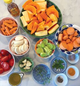 These are the days that make us crave a warm, comforting soup. This hearty harvest veggie soup recipe includes my favorite cooking technique — roasting vegetables on a sheet pan. We layered tons of root veggies—butternut squash, sweet potatoes, carrots and turnips — with aromatics like leek, onions, garlic, tomatoes, sage and thyme. We seasoned with olive oil, turmeric, Himalayan pink salt, freshly ground black pepper and a generous drizzle of honey.