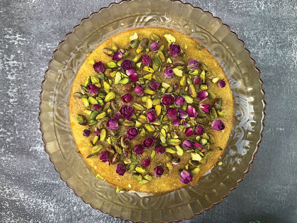 Our recipe includes nuts — almond flour, slivered almonds and pistachios — which symbolize wealth and abundance. There is citrus — orange juice and orange rind in the honey syrup glaze and orange zest in the batter. The cool cardamom in our syrup represents warmth, sensuality and hospitality. The exquisite pale pink baby rosebuds that decorate the cake convey a message of love, beauty and the divine.